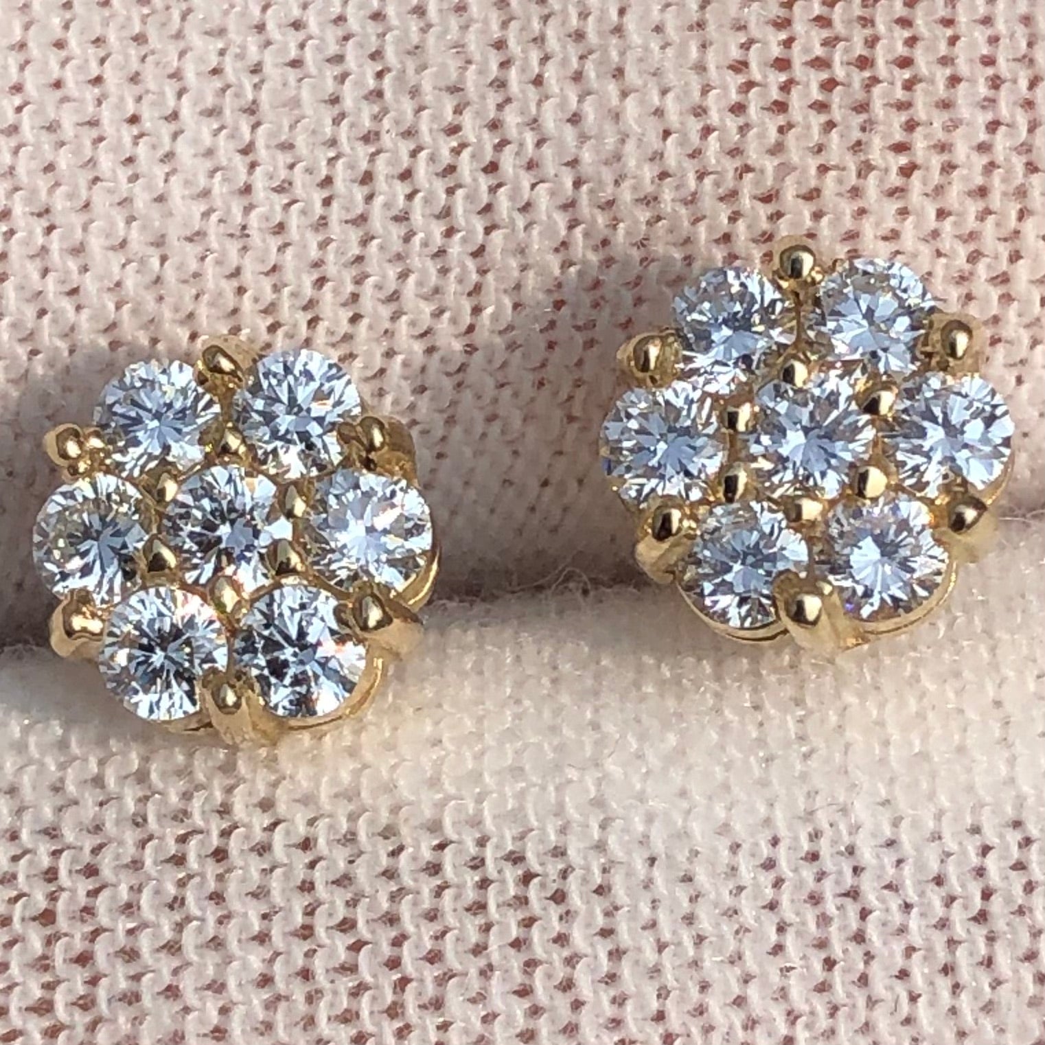 The pair contains approximately 1 total carat weight of certified lab grown diamonds, selected for their VS clarity and bright, clean appearance. The 14K yellow gold settings provide durability and rich color while securely holding each diamond in place for long-lasting wear. The flower cluster style creates the appearance of larger diamonds while maintaining a balanced and elegant profile.